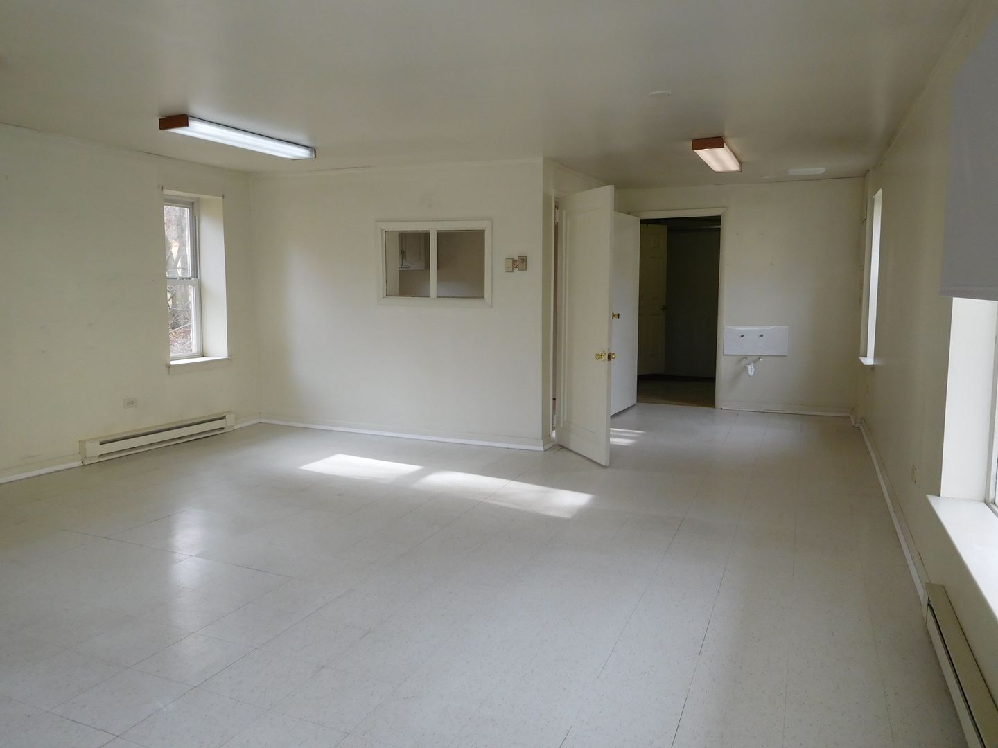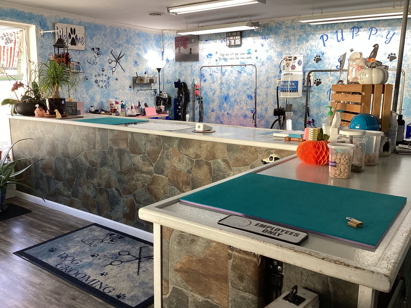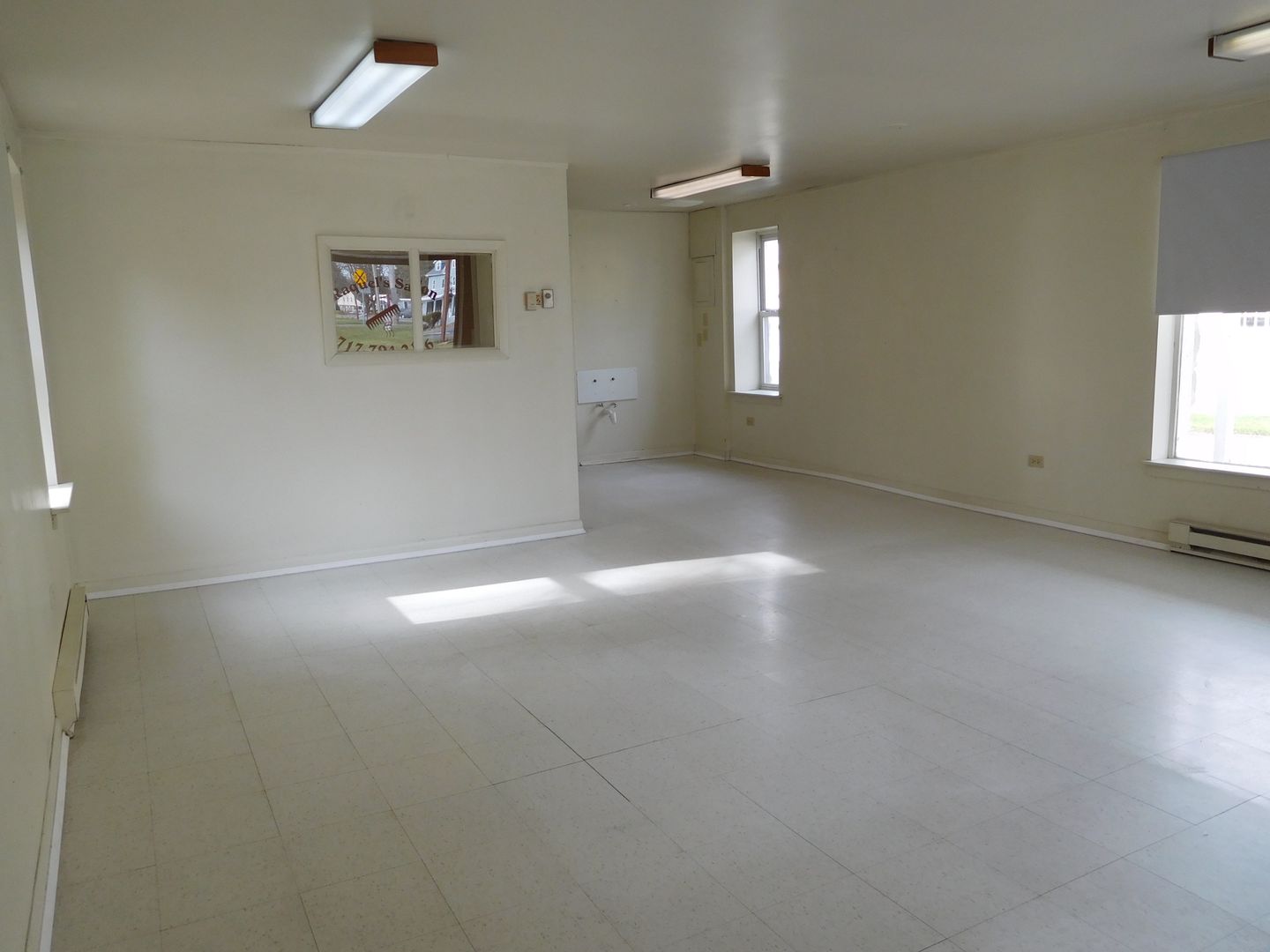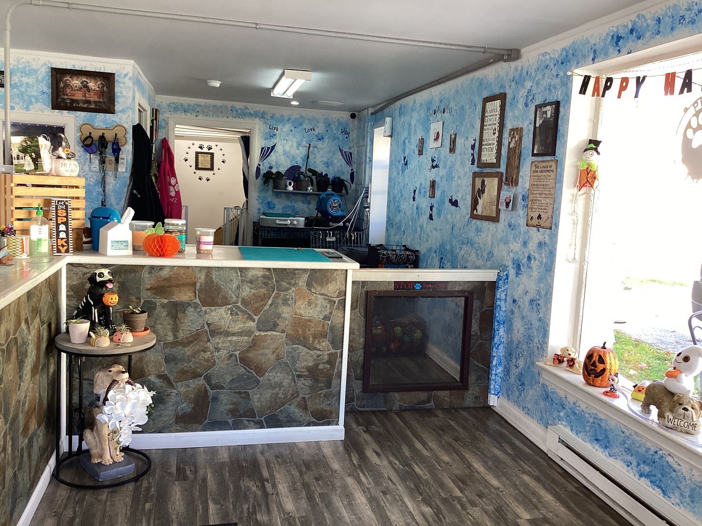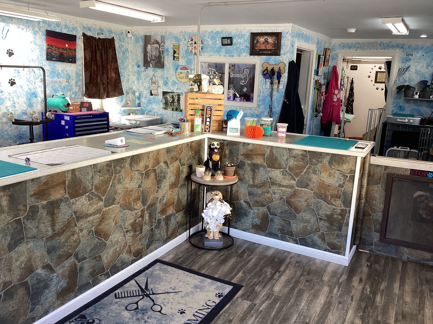 Large space on an active corner. Has been a dog-grooming facility for about eight years, was a styling salon for many years before. Large picture windows. Laundry hook-ups. Two-piece bathroom facility. Large main room, ample "back-room" area and separate "office" area. Service counter area in pictures will be left in place. Other grooming equipment NOT included in the lease. Ample customer parking. Trash removal in a dumpster and lawn care are provided in the rent. Tenant pays utilties. Tenant will paint and furnish to suit their business.
